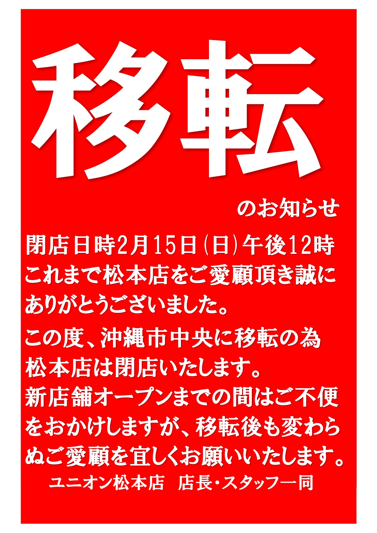 松本店 閉店のお知らせ